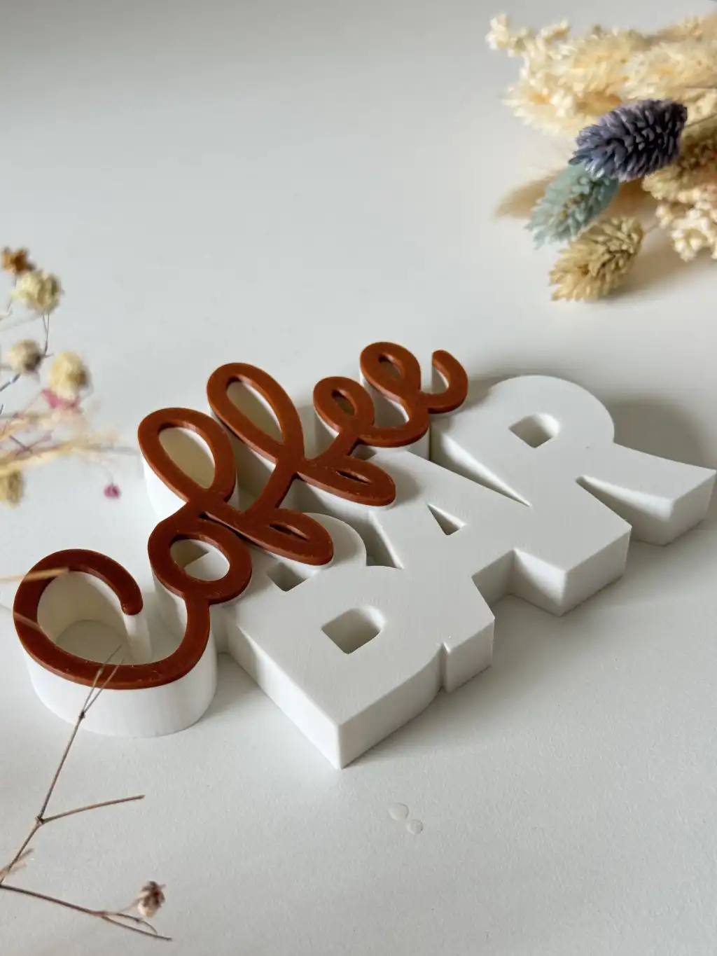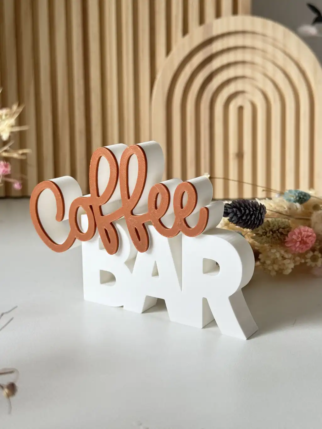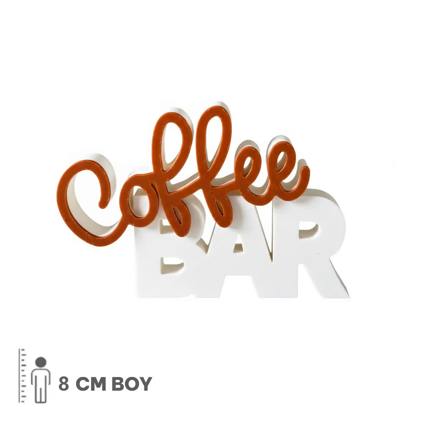 Kahverengi el yazısı fontuyla sıcak bir "Coffee" vurgusu ve altındaki beyaz blok harflerle modern bir "BAR" duruşu sergileyen bu obje, tezgahınızın üzerinde davetkar bir atmosfer yaratır.