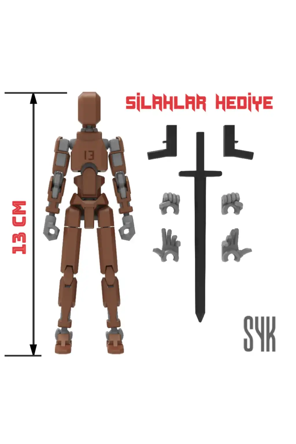 Tüm eklemleri hareketli olan bu Dummy figürü, çocukların eğlenceli ve interaktif oyun saatleri geçirmesini sağlar.; Kahverengi ve Gri renkleriyle dikkat çeken tasarım, çocukların ilgisini kolayca çeker.; 3 boyutlu yazıcı ile üretilen bu Dummy, çocukların hayal gücünü desteklerken aynı zamanda motor becerilerinin gelişimine katkı sağlar.; Ürünün dış gövdesi PLA, iskeleti ise dayanıklı PETG malzemeden üretilmiştir.; Montajlanmış şekilde gönderilmektedir.; (Boy: 13 cm).; DUMMY 13 Printable Jointed Figure © 202
