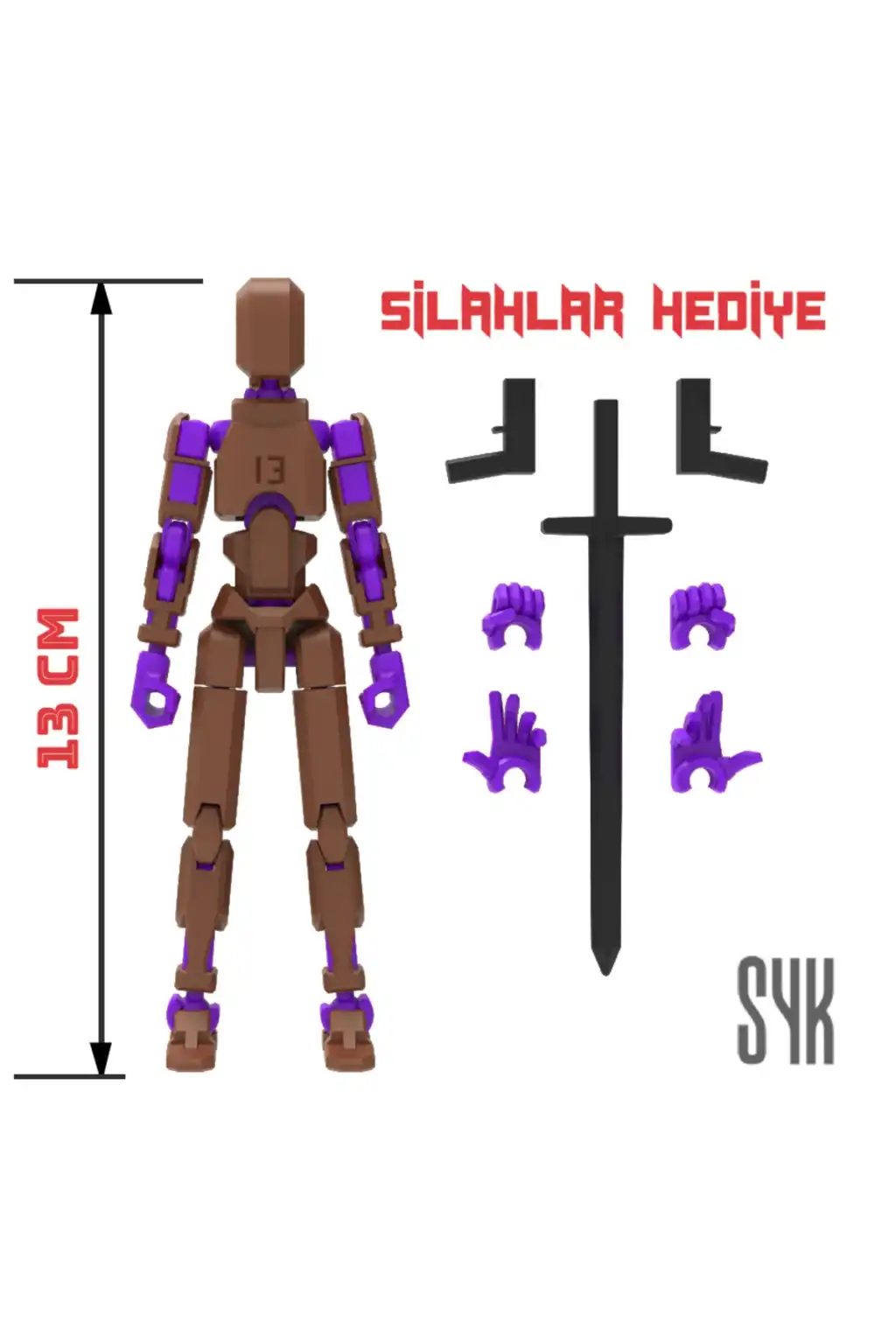 Tüm eklemleri hareketli olan bu Dummy figürü, çocukların eğlenceli ve interaktif oyun saatleri geçirmesini sağlar.; Kahverengi ve Mor renkleriyle dikkat çeken tasarım, çocukların ilgisini kolayca çeker.; 3 boyutlu yazıcı ile üretilen bu Dummy, çocukların hayal gücünü desteklerken aynı zamanda motor becerilerinin gelişimine katkı sağlar.; Ürünün dış gövdesi PLA, iskeleti ise dayanıklı PETG malzemeden üretilmiştir.; Montajlanmış şekilde gönderilmektedir.; (Boy: 13 cm).; DUMMY 13 Printable Jointed Figure © 202