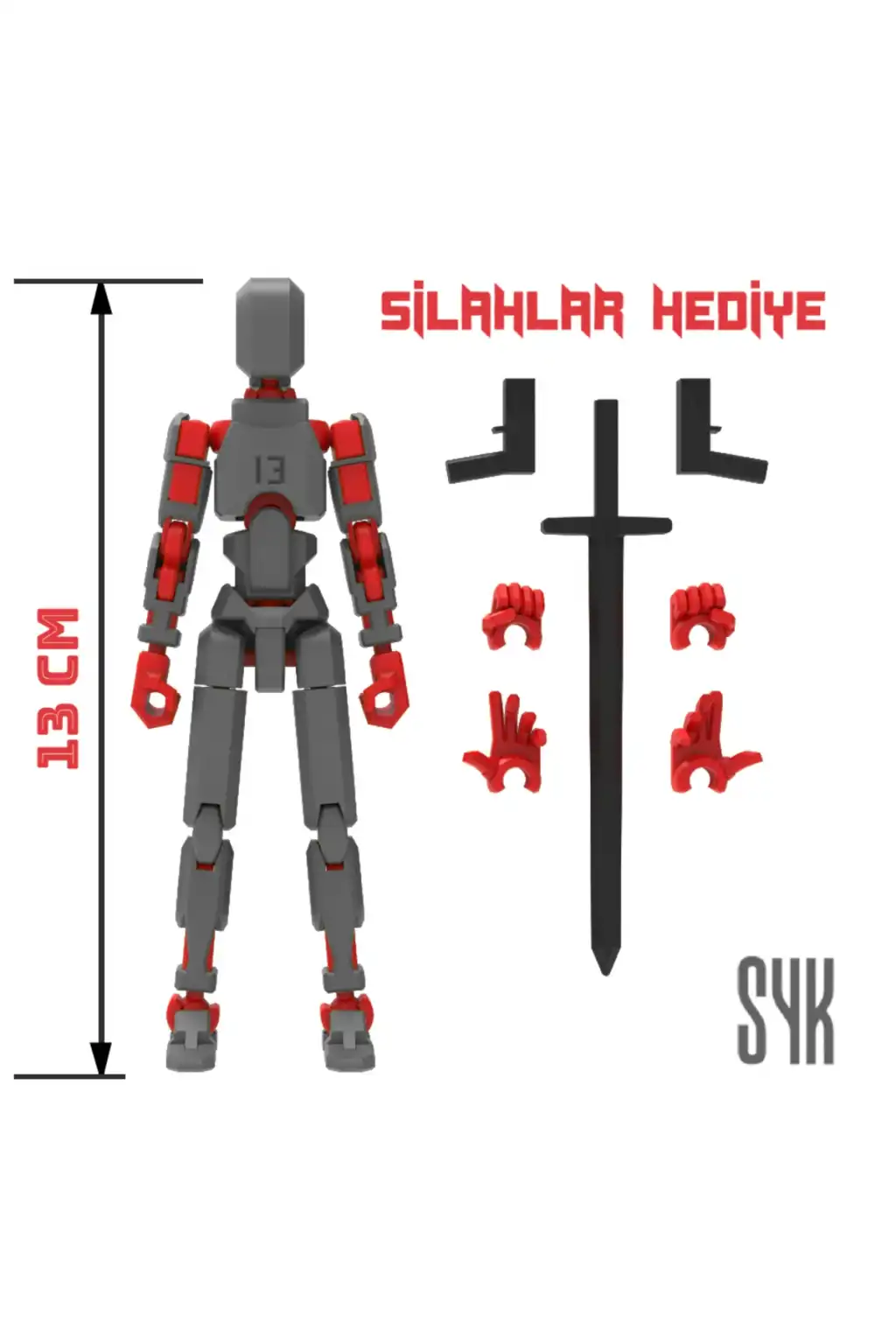 Tüm eklemleri hareketli olan bu Dummy figürü, çocukların eğlenceli ve interaktif oyun saatleri geçirmesini sağlar.; Koyu Gri ve Kırmızı renkleriyle dikkat çeken tasarım, çocukların ilgisini kolayca çeker.; 3 boyutlu yazıcı ile üretilen bu Dummy, çocukların hayal gücünü desteklerken aynı zamanda motor becerilerinin gelişimine katkı sağlar.; Ürünün dış gövdesi PLA, iskeleti ise dayanıklı PETG malzemeden üretilmiştir.; Montajlanmış şekilde gönderilmektedir.; (Boy: 13 cm).; DUMMY 13 Printable Jointed Figure © 2