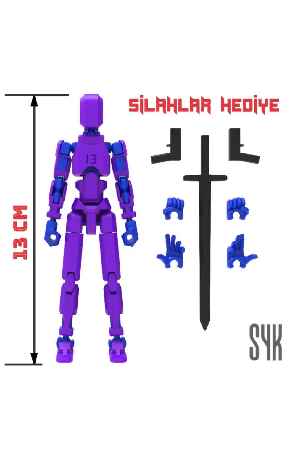 Tüm eklemleri hareketli olan bu Dummy figürü, çocukların eğlenceli ve interaktif oyun saatleri geçirmesini sağlar.; Mor ve Mavi renkleriyle dikkat çeken tasarım, çocukların ilgisini kolayca çeker.; 3 boyutlu yazıcı ile üretilen bu Dummy, çocukların hayal gücünü desteklerken aynı zamanda motor becerilerinin gelişimine katkı sağlar.; Ürünün dış gövdesi PLA, iskeleti ise dayanıklı PETG malzemeden üretilmiştir.; Montajlanmış şekilde gönderilmektedir.; (Boy: 13 cm).; DUMMY 13 Printable Jointed Figure © 2023 by L