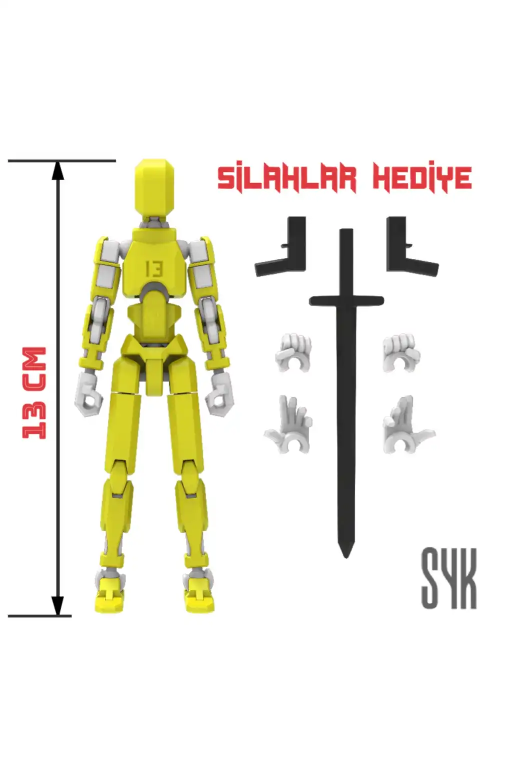 Tüm eklemleri hareketli olan bu Dummy figürü, çocukların eğlenceli ve interaktif oyun saatleri geçirmesini sağlar.; Sarı ve Beyaz renkleriyle dikkat çeken tasarım, çocukların ilgisini kolayca çeker.; 3 boyutlu yazıcı ile üretilen bu Dummy, çocukların hayal gücünü desteklerken aynı zamanda motor becerilerinin gelişimine katkı sağlar.; Ürünün dış gövdesi PLA, iskeleti ise dayanıklı PETG malzemeden üretilmiştir.; Montajlanmış şekilde gönderilmektedir.; (Boy: 13 cm).; DUMMY 13 Printable Jointed Figure © 2023 by