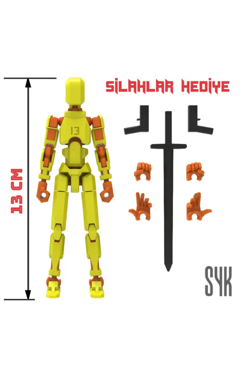 Tüm eklemleri hareketli olan bu Dummy figürü, çocukların eğlenceli ve interaktif oyun saatleri geçirmesini sağlar.; Sarı ve Turuncu renkleriyle dikkat çeken tasarım, çocukların ilgisini kolayca çeker.; 3 boyutlu yazıcı ile üretilen bu Dummy, çocukların hayal gücünü desteklerken aynı zamanda motor becerilerinin gelişimine katkı sağlar.; Ürünün dış gövdesi PLA, iskeleti ise dayanıklı PETG malzemeden üretilmiştir.; Montajlanmış şekilde gönderilmektedir.; (Boy: 13 cm).; DUMMY 13 Printable Jointed Figure © 2023