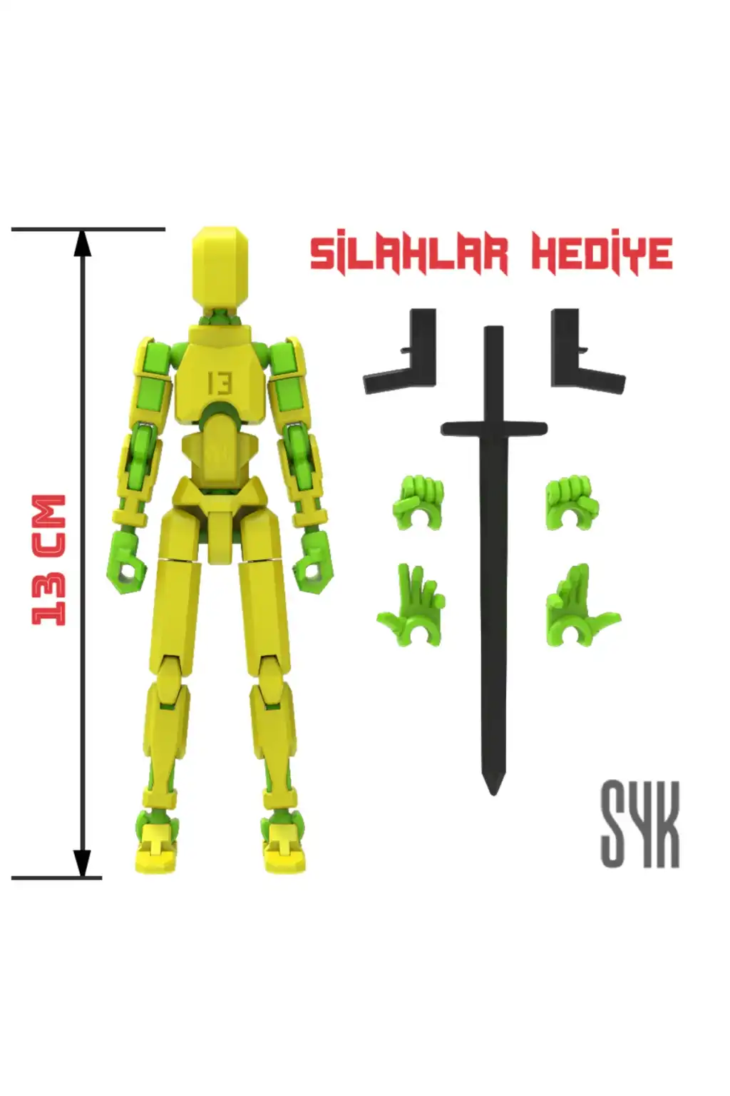 Tüm eklemleri hareketli olan bu Dummy figürü, çocukların eğlenceli ve interaktif oyun saatleri geçirmesini sağlar.; Sarı ve Yeşil renkleriyle dikkat çeken tasarım, çocukların ilgisini kolayca çeker.; 3 boyutlu yazıcı ile üretilen bu Dummy, çocukların hayal gücünü desteklerken aynı zamanda motor becerilerinin gelişimine katkı sağlar.; Ürünün dış gövdesi PLA, iskeleti ise dayanıklı PETG malzemeden üretilmiştir.; Montajlanmış şekilde gönderilmektedir.; (Boy: 13 cm).; DUMMY 13 Printable Jointed Figure © 2023 by
