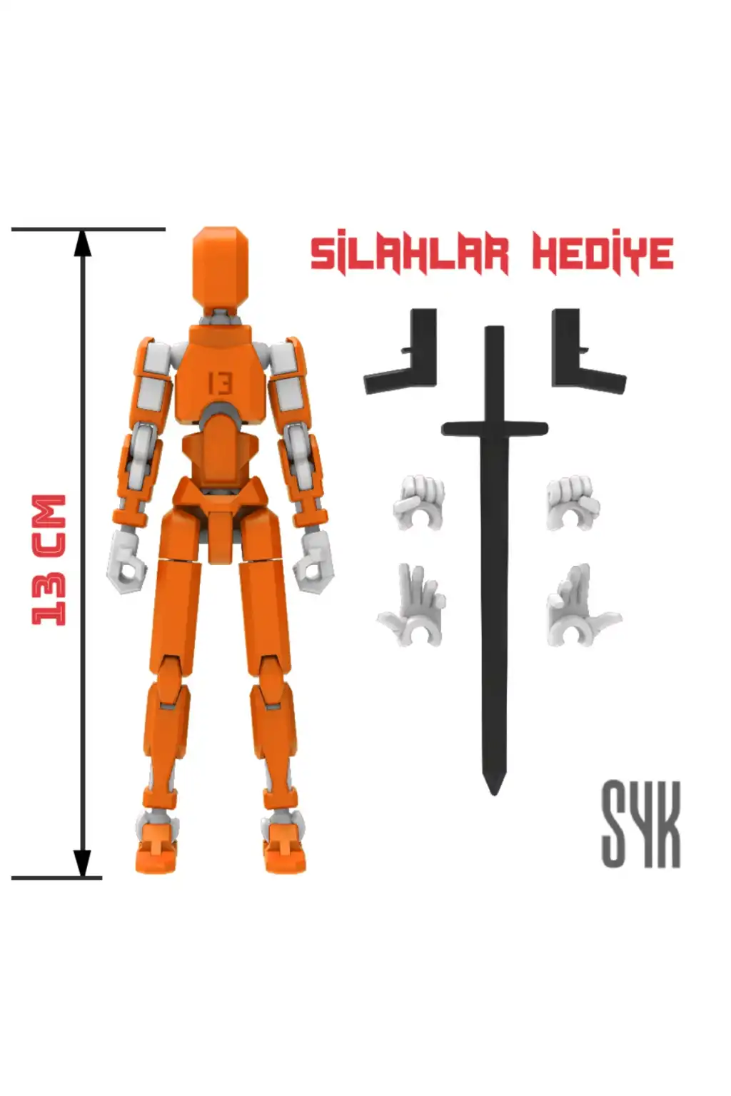 Tüm eklemleri hareketli olan bu Dummy figürü, çocukların eğlenceli ve interaktif oyun saatleri geçirmesini sağlar.; Turuncu ve Beyaz renkleriyle dikkat çeken tasarım, çocukların ilgisini kolayca çeker.; 3 boyutlu yazıcı ile üretilen bu Dummy, çocukların hayal gücünü desteklerken aynı zamanda motor becerilerinin gelişimine katkı sağlar.; Ürünün dış gövdesi PLA, iskeleti ise dayanıklı PETG malzemeden üretilmiştir.; Montajlanmış şekilde gönderilmektedir.; (Boy: 13 cm).; DUMMY 13 Printable Jointed Figure © 2023