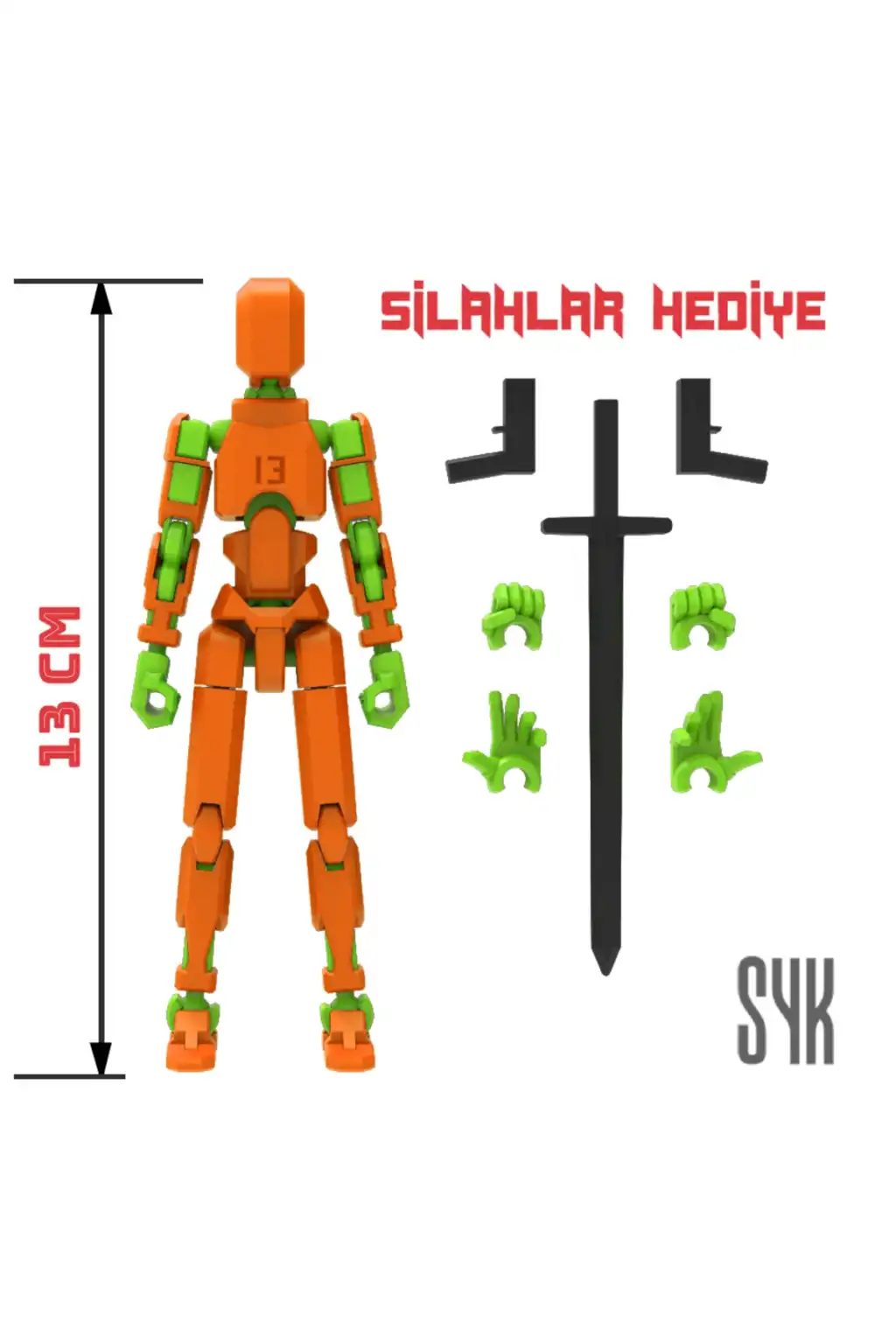 Tüm eklemleri hareketli olan bu Dummy figürü, çocukların eğlenceli ve interaktif oyun saatleri geçirmesini sağlar.; Turuncu ve Yeşil renkleriyle dikkat çeken tasarım, çocukların ilgisini kolayca çeker.; 3 boyutlu yazıcı ile üretilen bu Dummy, çocukların hayal gücünü desteklerken aynı zamanda motor becerilerinin gelişimine katkı sağlar.; Ürünün dış gövdesi PLA, iskeleti ise dayanıklı PETG malzemeden üretilmiştir.; Montajlanmış şekilde gönderilmektedir.; (Boy: 13 cm).; DUMMY 13 Printable Jointed Figure © 2023