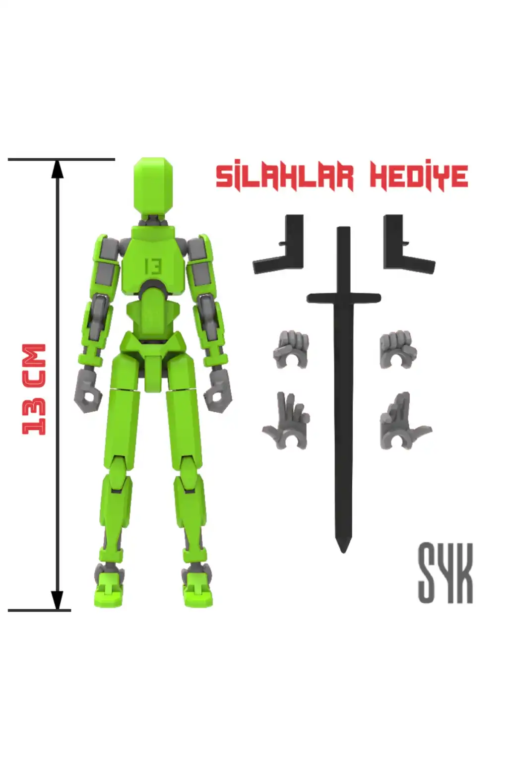 Tüm eklemleri hareketli olan bu Dummy figürü, çocukların eğlenceli ve interaktif oyun saatleri geçirmesini sağlar.; Yeşil ve Gri renkleriyle dikkat çeken tasarım, çocukların ilgisini kolayca çeker.; 3 boyutlu yazıcı ile üretilen bu Dummy, çocukların hayal gücünü desteklerken aynı zamanda motor becerilerinin gelişimine katkı sağlar.; Ürünün dış gövdesi PLA, iskeleti ise dayanıklı PETG malzemeden üretilmiştir.; Montajlanmış şekilde gönderilmektedir.; (Boy: 13 cm).; DUMMY 13 Printable Jointed Figure © 2023 by